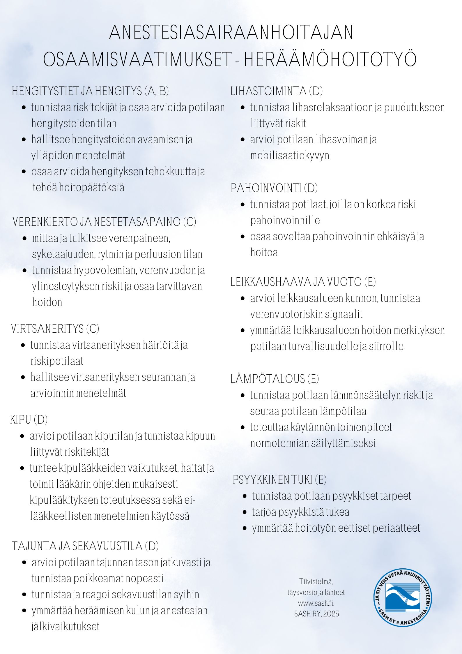 Heräämöhoitotyö on erittäin vaativaa ja laaja-alaista osaamista vaativaa työtä. Anestesiasairaanhoitajan tulee hallita alla olevat kokonaisuudet ja kirjata ja raportoida ne asianmukaisesti.