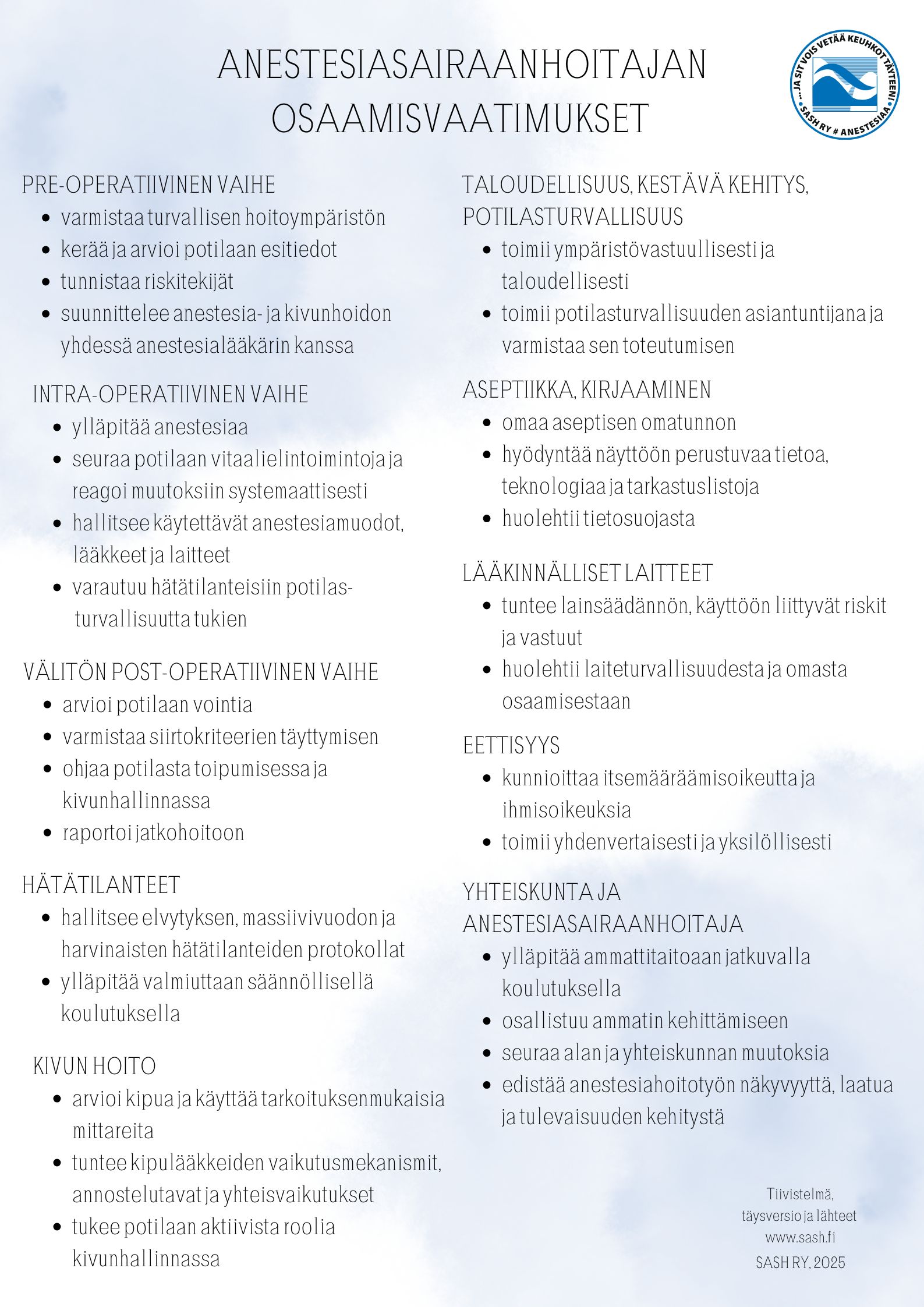 Suomen Anestesiasairaanhoitajat ry on laatinut päivitetyt osaamisvaatimukset, jotka kuvaavat Suomessa työskentelevien anestesiasairaanhoitajien vaativaa ja laajaa työnkuvaa. Osaamisvaatimusten tarkoituksena on avata työn keskeisiä tehtäviä, tarvittavia osaamisalueita, potilasturvallisuus- ja laatuvaatimuksia.